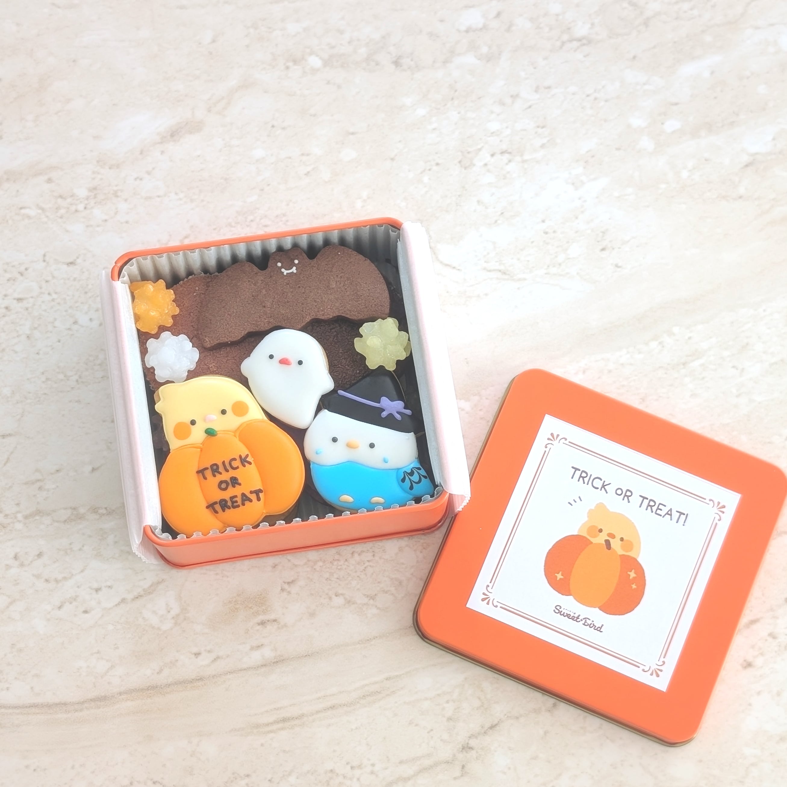 かぼちゃからひょっこり顔を出すオカメインコ、魔女の帽子をかぶったセキセイインコにおばけ文鳥のアイシングクッキー。